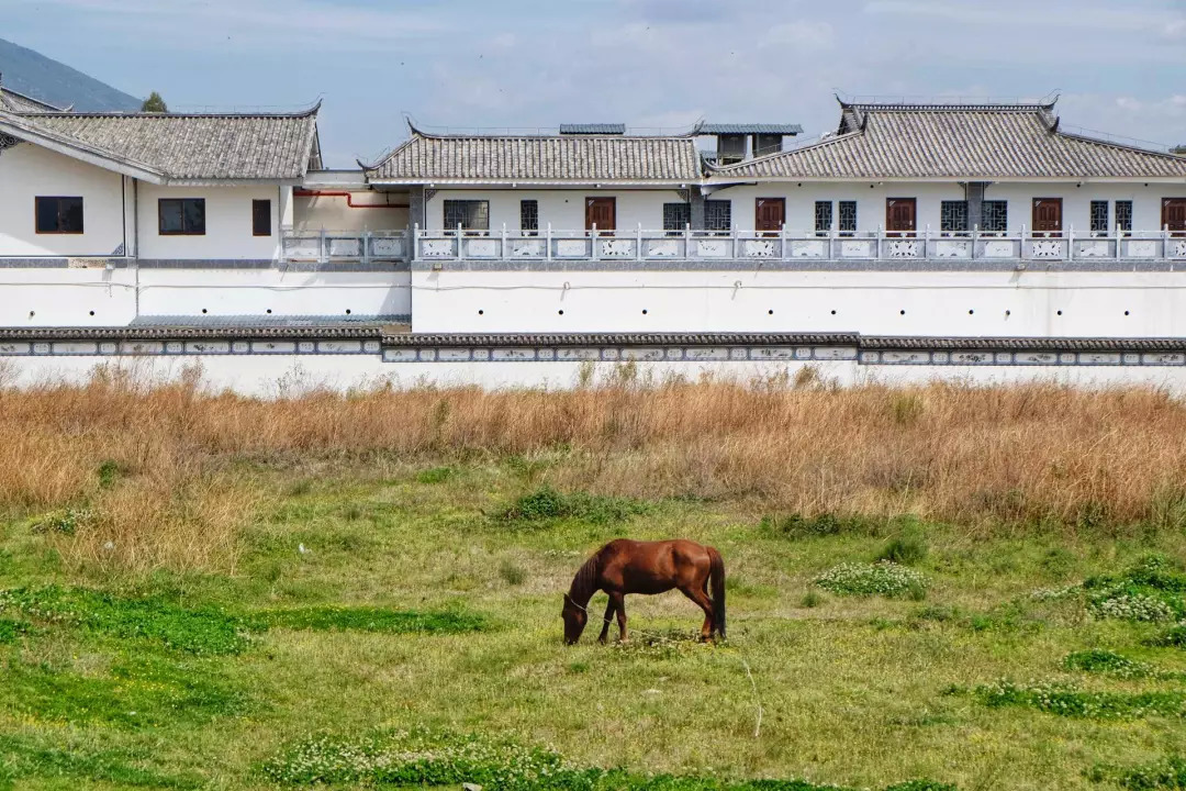 到达喜洲时,一匹肌肉发达的马正在草地里吃草,阳光把它的皮肤晒得闪闪发亮。