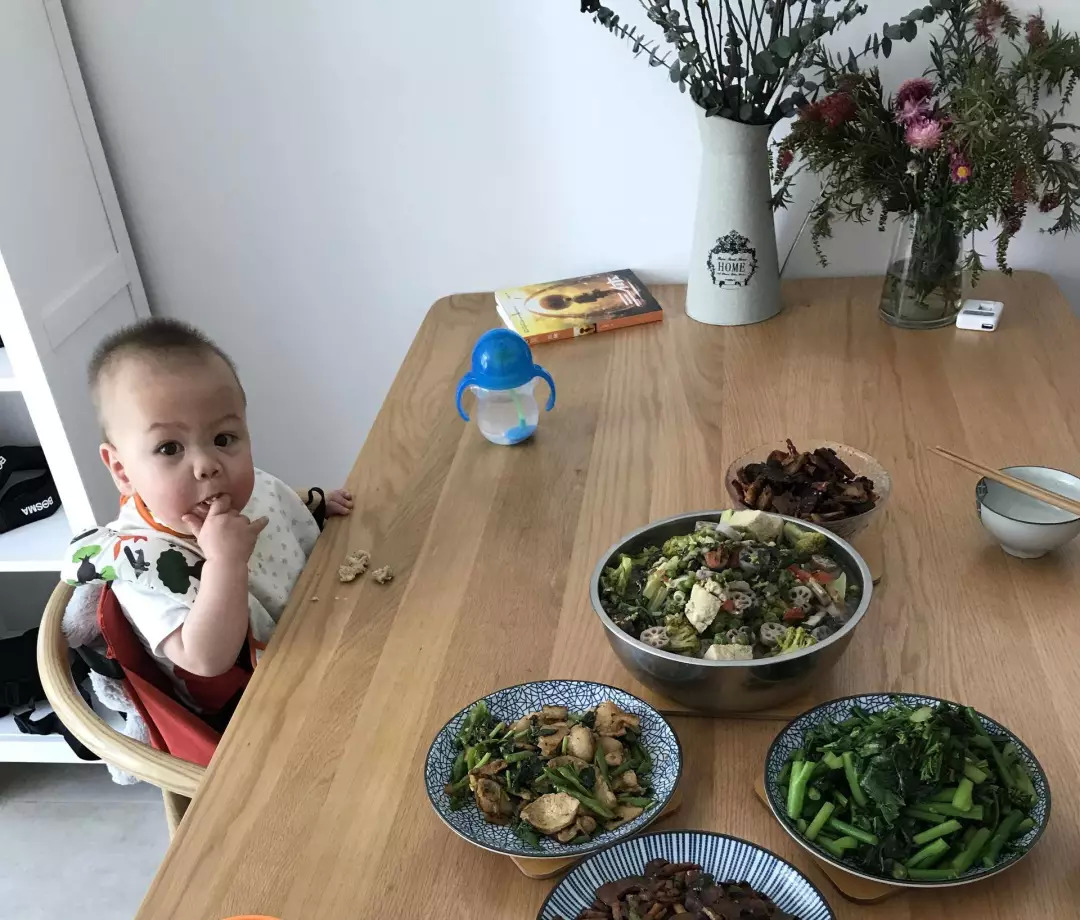 幼安一岁,已经开始自己吃饭。吃饭方式是将食物平放在桌面上,他自己用手抓着吃,这样是为了培养他的独立性,让他自己决定自己吃什么,吃多少。