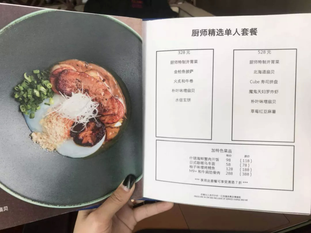 说着,SK让同事递来一份特别的精致菜单“厨师精选单人套餐”。上面一共有两个价位的选择,所有菜品,全是针对独自前来用餐的客人。很贴心,并且一目了然,如果就着发办Omakase的形式,一个人外出就餐,也不再是件寂寞尴尬的事了。