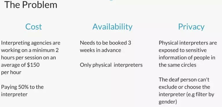 然而,Gilad也发现,虽然手语翻译对于聋哑人极为重要,使用手语翻译在聋哑人社区中却并不普遍。这是为何?经过调查,Gilad发现,目前在美国手语翻译服务界面临的三大问题。
