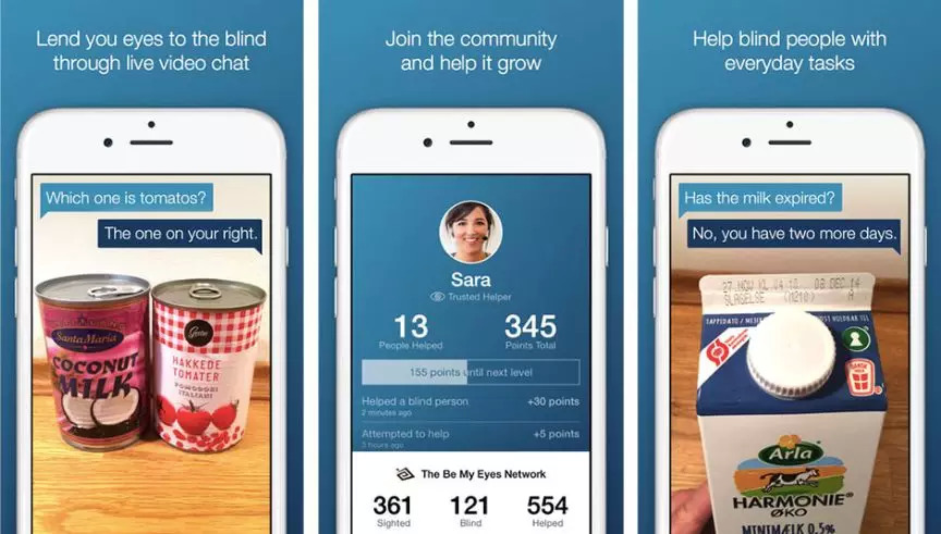 2017年,一款名为 BeMyEyes 的应用软件出现。这款软件通过帮助需要帮助的盲人即时找到志愿者来为他们阅读文字说明或文件。