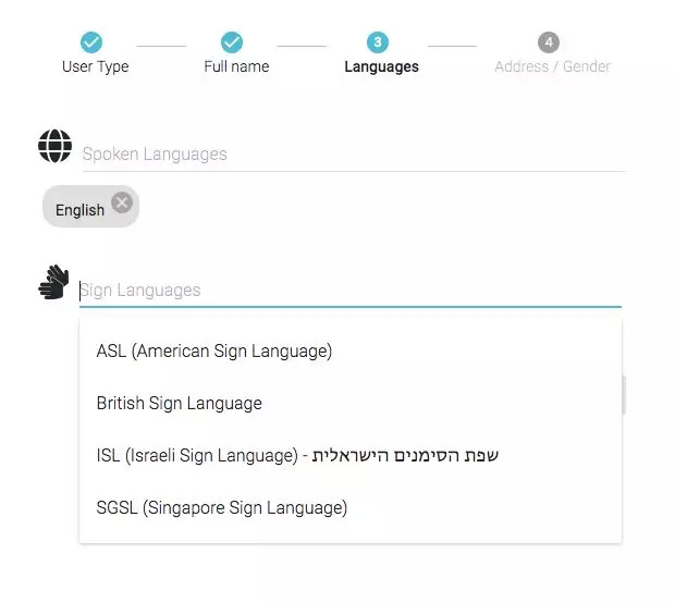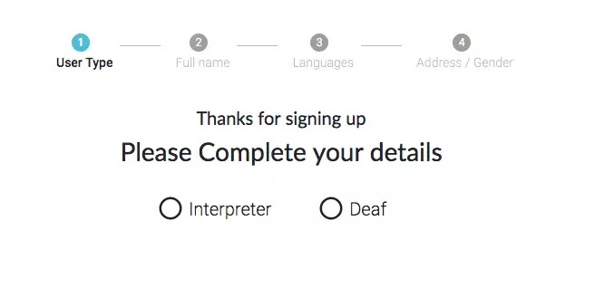 首先,在页面选择你是Deaf还是Interpreter。随后,只需要填入基本信息:姓名、所在地、以及所使用的手语。随后,电话号码认证。便可以完成注册。