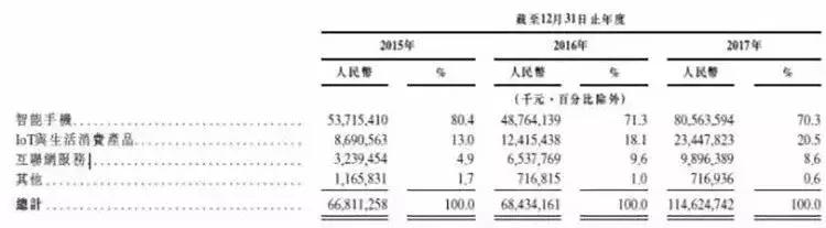 根据招股书显示,小米从2015-2017年的收入分别为668.11亿元、684.34亿元、1146.25亿元。而这其中的大部分收入来自手机业务,三年分别占比为80.4%、71.3%、70.3%。从数字来看,这依然是一家不折不扣的“卖手机”的公司。