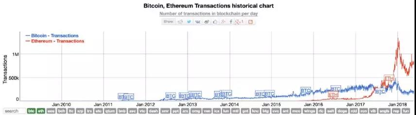 2015年12月9日,也就是在诞生超过5年的时候,比特币达到200000笔日交易量,而以太坊于去年6月6日就达到了这个里程碑,仅用时2年。