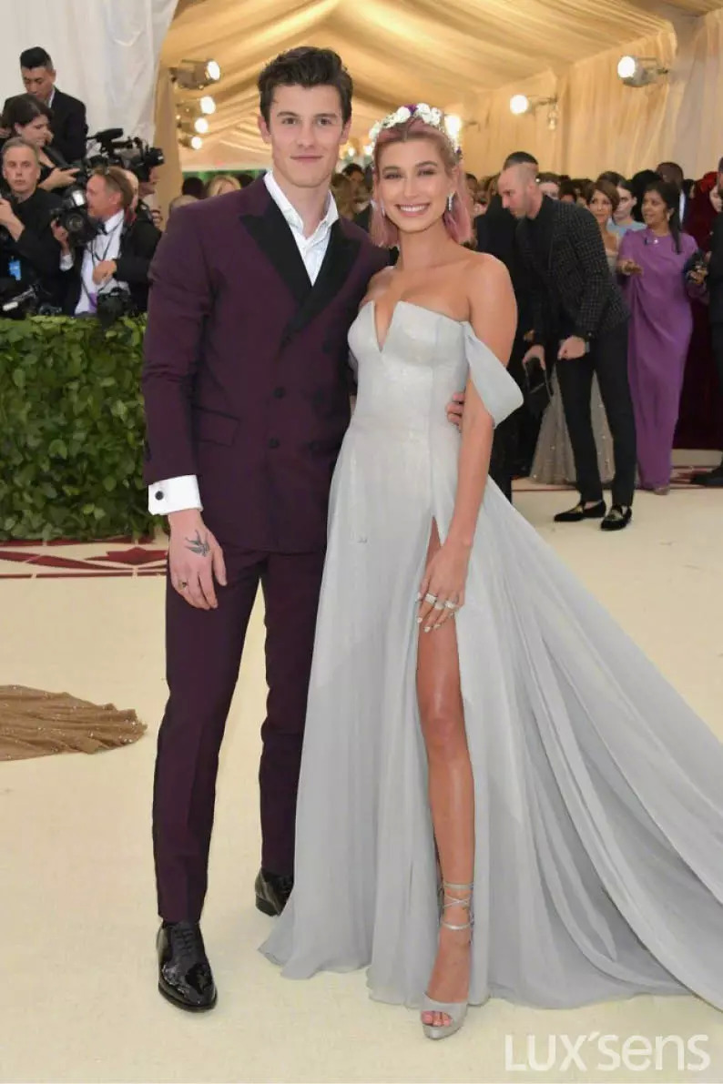 而2018年的 Met Gala 上,海莉则选了更低调的款式,在不经意中透露出“我有大长腿”的信息。