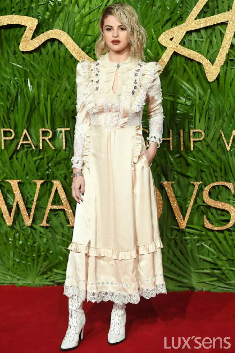 在 Tiffany Paper Flowers Even NYC 的礼服挑选上,只用了裙子上若有若无的腰线就达到了“胸以下全是腿”的效果了。