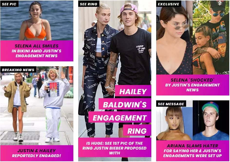 八卦网站首页全是比伯、海莉和前女友 Selena Gomez 的消息