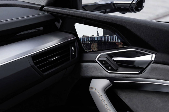 奥迪e-tron车窗上的这两块屏可以放大和缩小,还可以选择三种预设的模式,三种模式分别适用于停车、转弯和高速驾驶情景。此外,盲区监控功能也集成在这块屏幕上。