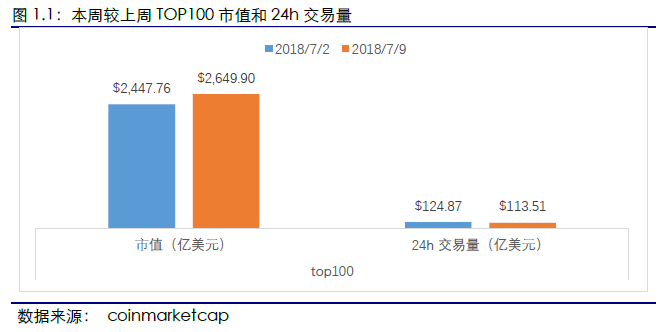 本周区块链资产市值普遍上涨,TOP100项目中71个项目市值有不同程度上涨,29个项目下跌。据coinmarketcap数据,截止2018年7月9日,全球区块链资产市值前100项目总市值为2,649.90亿美元,上涨8.48%,共5个项目新进入TOP100。7月9日,Bitcoin价格为6,831.20美元,较上周上涨7.11%,Ethereum价格为493.14美元,上涨8.63%。火币主力指数(HUOBI 10)本周上行7.03%。