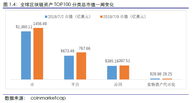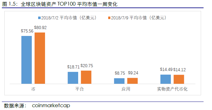 全球区块链资产TOP100项目分类组成稳定。2018年7月9日,在市值排名前100的项目中,四类项目数量占比保持平稳,平台类项目数量增加个,应用类项目数量减少1个,币类和实物资产代币化项目数量不变。市值占比最大仍为币类项目,占比54.96%,与上周相比持平。