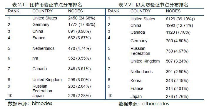 比特币节点数略有减少、以太坊节点数略有增加。截止2018年7月8日,比特币验证节点达到9730个,比上周略增加0.35%,其中美国有2353个节点,占比24.37%,德国有1721个节点,占比17.83%,中国有910个节点,占比9.43%。