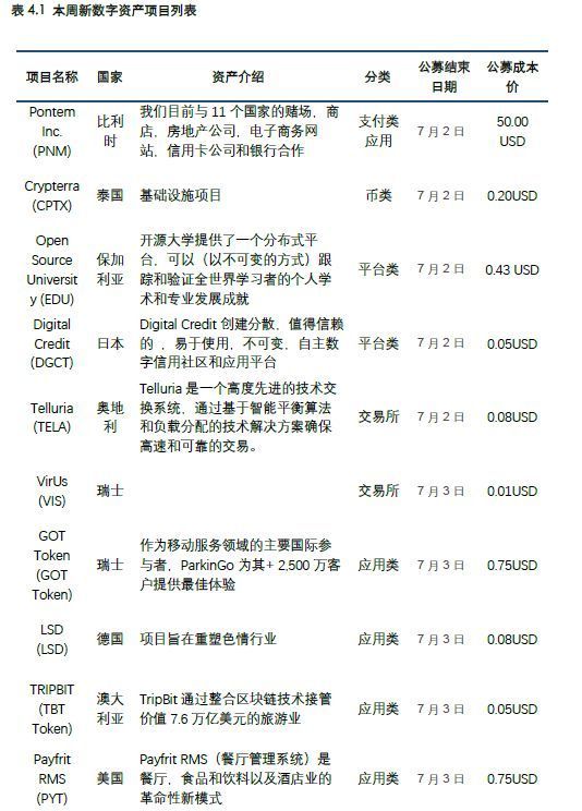 本周完成公募融资的新数字资产项目共有37个。从国家或地区上来看,34个资产项目收集到国家信息,拥有项目数最多的国家为瑞士,拥有项目4个,占比11.8%。第二梯队国家为英国,新加坡,日本和美国,各自拥有3个项目,分别占比8.8%。第三梯队国家为澳大利亚,印度和德国,各自拥有2个项目,占比5.9%。其余12个国家各自拥有项目数均为1个,占比分别为2.9%。从项目类型上来看,37个资产项目有明确分类,资产类别最多的为应用类,包含17个,占比45.9%;其中子类别最多的是投资类应用,项目数为4个。接下来是平台类(21.6%),交易所(16.2%),币类(13.5%)。本周新数字资产项目国家分布广,最多的为瑞士;资产类型基本为应用型,投资类应用是其中主要应用领域。