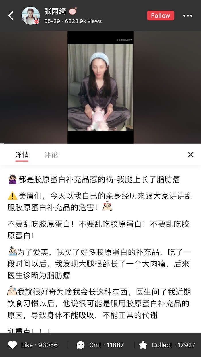 再来听听另一种明星推荐的声音。最近在小红书上做起了博主的女明星张雨绮就实名diss了口服胶原蛋白,说自己得了脂肪瘤,正是因为不当地服用了胶原蛋白。