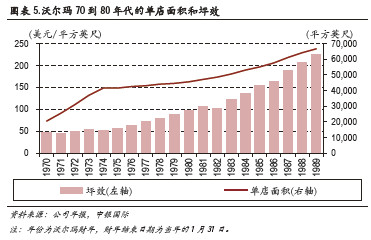 从沃尔玛最重要的发展阶段——70年代至80年代在单店面积和坪效的增长可以看出,店的面积越大、商品越丰富,坪效就越高。“一站式购物”不仅是用户需求,也是传统零售营业的有力保障。