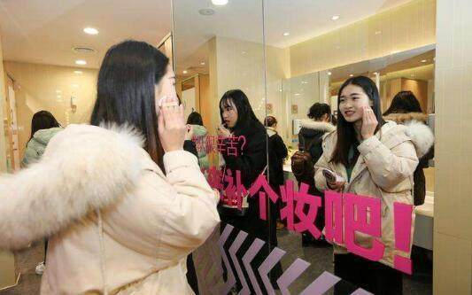 这款试妆镜可以试各种口红色号、腮红、睫毛膏,不满意一键卸妆重来,满意了还可以拍一张定妆照,遇到心仪产品还可扫码购买并送货到家,使女厕所排队等待的过程变成了“试试试、买买买”的有趣体验。