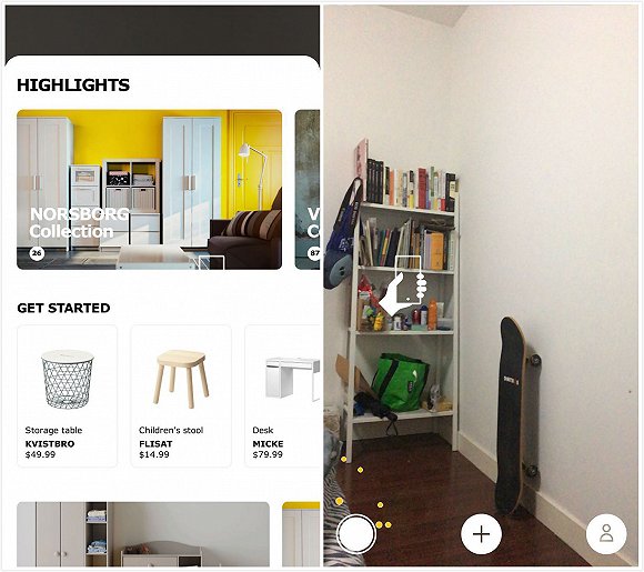 在2017年6月宜家正式上线了AR应用IKEA Place,这是一款帮你置办新家具的移动应用,可以直接把一款真实大小的家居塞进现实空间里并直接下单购买,比起以往得事先测量好各种空间尺寸的繁琐准备动作再去购买轻松许多。