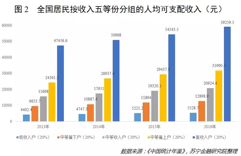 消费升级的前提是收入攀升。虽然我国居民的整体收入水平一直稳步增长着,但是对于不同收入群体来说,其收入的提升幅度与速度却有明显差异,而“贫者更贫,富者更富”这一规律也如同自然法则一般客观存在着。