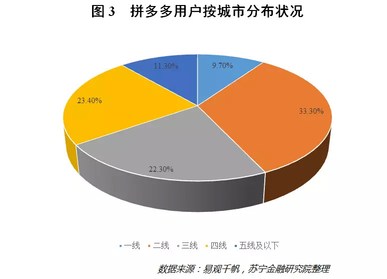 根据我国目前的基本情况,人们的平均收入水平在一二三四五线城市大体上是逐级递减的,而拼多多的主要客户并非那些一二线城市的消费升级群体,而是三线以下城市较低收入人群的消费刚需。根据易观千帆的监测数据,拼多多近60%的用户均来自三线以下城市,这一比例显著高于其他传统电商平台(参见图3),而这部分人群多为低收入者。