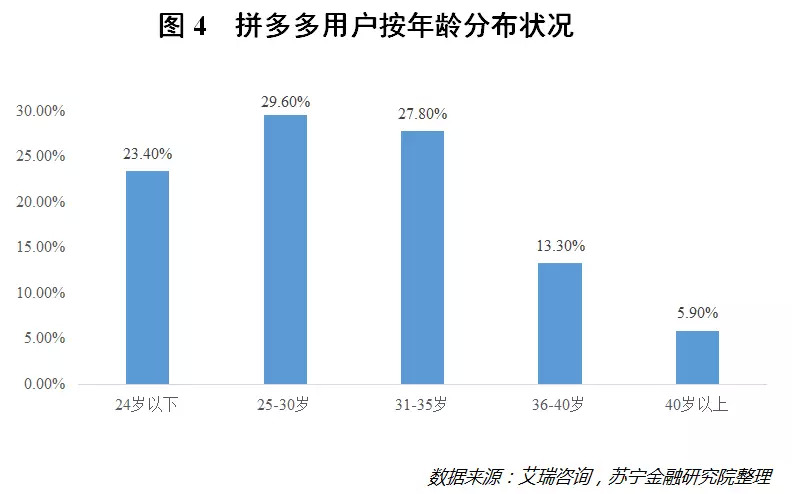 此外,从年龄分布状况来看,拼多多有一半以上的用户都在30岁以下(参见图4),这个年龄段的群体往往收入水平相对有限,他们更倾向于追求低价实惠的商品,这便进一步成就了拼多多“农村包围城市”的快速发展之路。