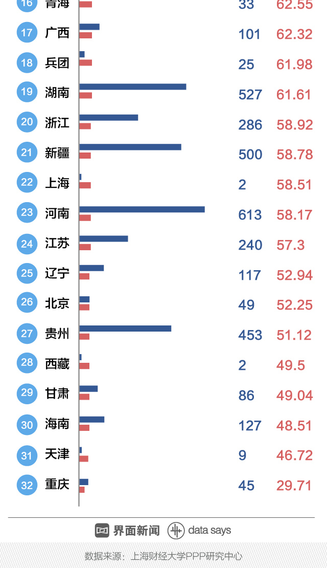 不同省份透明度指数差异较大。较为出人意料的是,排名前五的省份并非是全国经济发展水平最高的。课题组负责人、上海财经大学公共经济与管理学院党委书记方芳在发布会上表示,在融资渠道较发达地区相对较少的情况下,这些省份可能是希望通过建设良好的PPP项目来更好地服务经济社会发展。