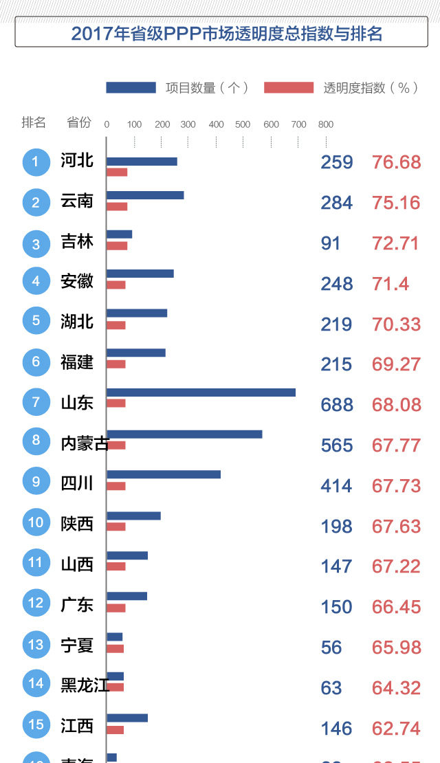 上海财经大学7月10日发布的一项调查显示,全国PPP(政府和社会资本合作项目)市场透明度刚过及格线,PPP市场透明度排名前五位的分别是河北省、云南省、吉林省、安徽省、湖北省。