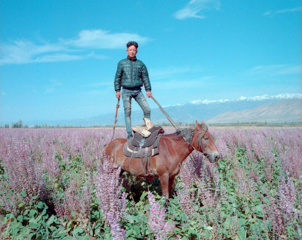 旁边有种植的香紫苏,紫色的一大片,我让他骑着马过去,这样色彩比较漂亮,有几张照片他竟然还站在马鞍上。