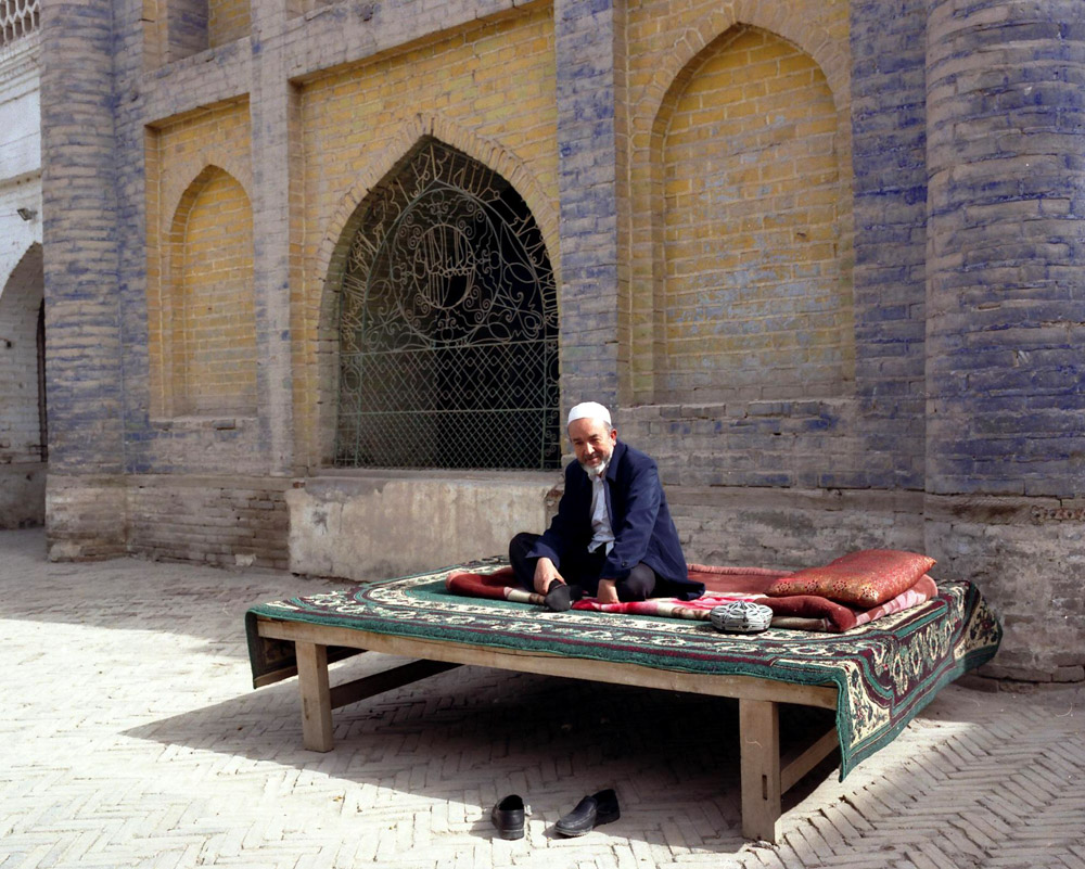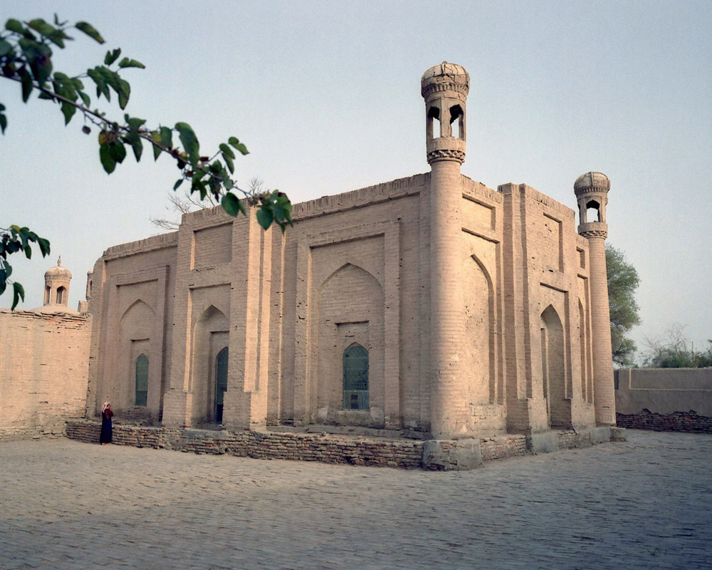 在新和县,一共找到三座清真寺。第一座琼阔恰清真寺。坐落在窄街里,清真寺外观特别漂亮。门锁着没有人,对面开饭馆的老板,他用钥匙打开门给我进去看了一下,做祈祷的大堂尤其美。