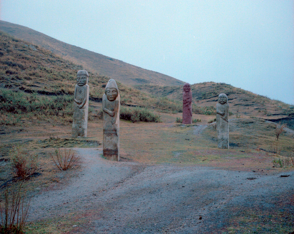 上午我去拍石人,在去伊宁的路上,刚过特克斯达坂就到了。正好是阴雨天,达坂上面有雾气,能见度低,到了石人位置正在下雨。九个石人,有的是后来建造的,有的是原始的,原始的那个造型古朴而粗糙。