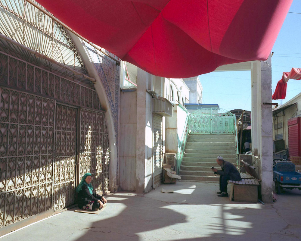 第二座是热斯特清真寺,是我在路上遇到的。清真寺前拆了一大片,以前可能都是平房。附近的一条街,搭了好多红色遮阳棚,卖衣服,卖鞋子。这两座清真寺都很高大,离近了都拍不全。