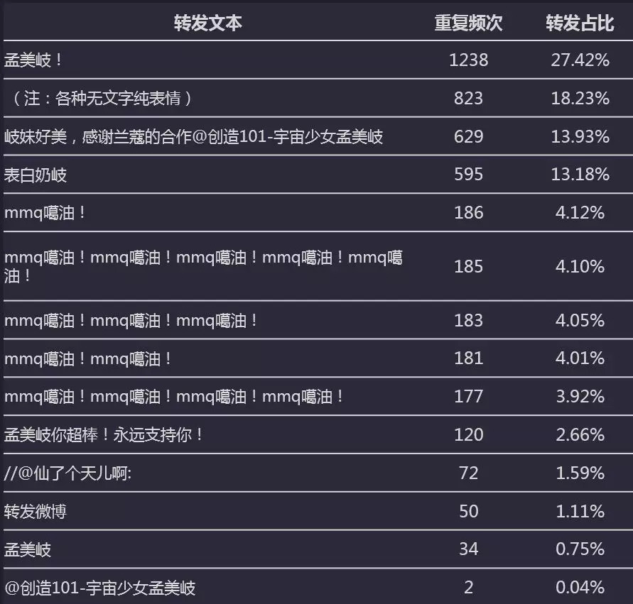其中,有4473条(占比99.07%)微博为高频次(≥34次)的重复转发及纯表情转发。如“孟美岐!”转发1238次,“岐妹好美,感谢兰蔻的合作@创造101-宇宙少女孟美岐 ”转发629次,“表白奶岐”转发595次,多个重复提及“mmq噶油!”的转发共计912条。