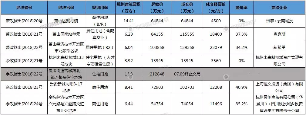 继7月6日余杭未来科技城大体量宅地、主城多宗涉宅地块遇冷,7月5日富阳两涉宅地块低溢价(均不足5%)成交,7月4日萧山空港新城低溢价(仅6.5%)成交后,此次萧山、余杭集中出让的6宗涉宅地块无一封顶成交,2018年下半年初始,杭州地市接连遇冷。