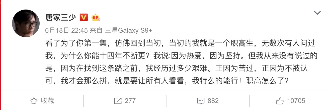 我觉得经过这两年,我比以前更坚强,以前可能是一个锋锐的唐家三少,现在可能是一个坚韧的唐家三少。工作上我一直是勇往直前,最快的几年是每年三倍的成长速度,从几百万变成大几千万的年收入。每年三倍,每年三倍往前冲,当速度慢下来我自己都不适应。
