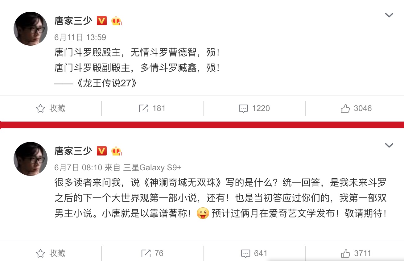 唐家三少:肯定(放第一)吧。商人算半个吧,其实我不愿意做一个商人,也不愿意开公司。我很多年前说过,我只想作为一个作家。对于我来说最快乐的事情是每天没有那么多乱七八糟,可以坐在那里写书。