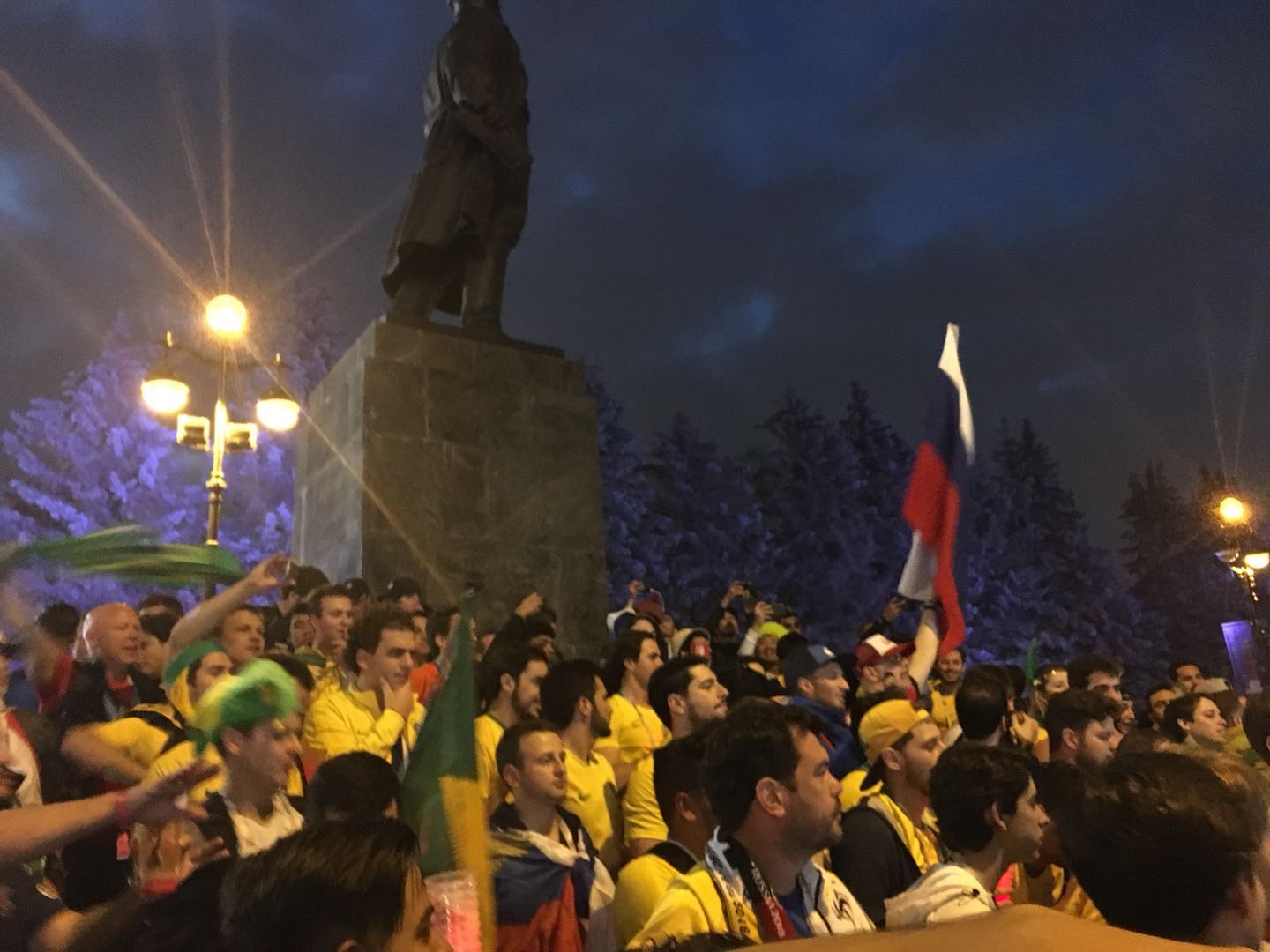 被从圣彼得堡体育场门外的台阶上赶下来之后,巴西球迷又转战体育场外的雕塑底下,然后是一路高唱,延续到地铁站里,直到凌晨一两点的圣彼得堡涅瓦大街上。