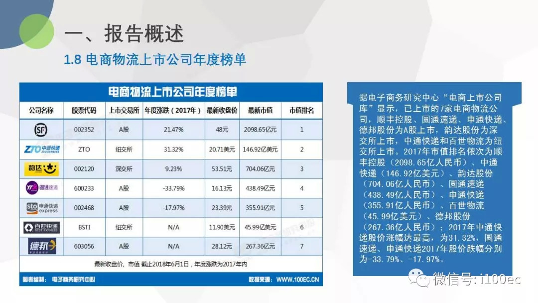 电商物流上市公司年度榜单:2017年市值排名依次为顺丰控股(2098.65亿人民币)、中通快递(146.92亿美元)、韵达股份(704.06亿人民币)、圆通速递(438.49亿人民币)、申通快递(355.91亿人民币)、百世物流(45.99亿美元)、德邦股份(267.36亿人民币)。