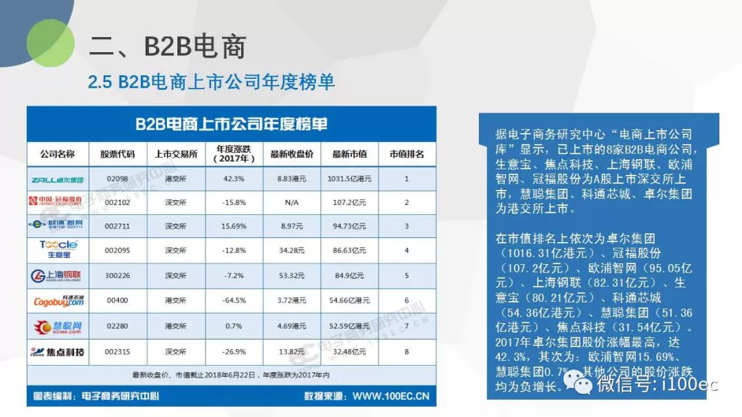 B2B电商上市公司年度榜单:依次为卓尔集团(1031.5亿港元)、冠福股份(107.2亿元)、欧浦智网(94.73亿元)、生意宝(86.63亿元)、上海钢联(84.9亿元)、科通芯城(54.66亿港元)、慧聪集团(52.59亿港元)、焦点科技(32.48亿元)。