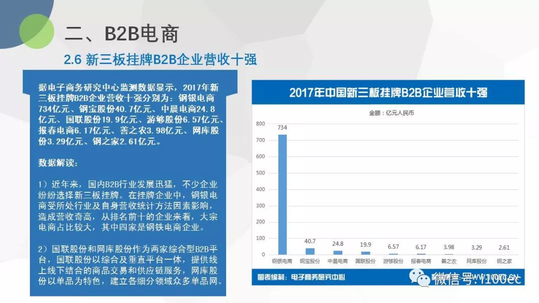 新三板挂牌B2B企业营收十强:2017年新三板挂牌B2B企业营收十强分别为:钢银电商734亿元、钢宝股份40.7亿元、中晨电商24.8亿元、国联股份19.9亿元、游够股份6.57亿元、报春电商6.17亿元、善之农3.98亿元、网库股份3.29亿元、钢之家2.61亿元。