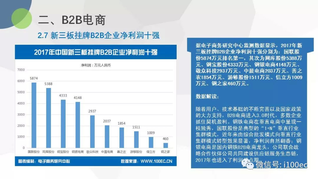 新三板挂牌B2B企业净利润十强:2017年新三板挂牌B2B企业净利润十强分别为:国联股份5874万元排名第一,其次为网库股份5388万元、钢宝股份4333万元、钢银电商4148万元、敬众科技2937万元、中晨电商2037万元、善之农1854万元、游够股份1511万元、信立方1009万元、钢之家460万元。