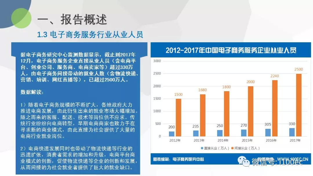 服务企业从业人员:2017年12月,中国电子商务服务企业直接从业人员超过330万人,由电子商务间接带动的就业人数,已超过2500万人。