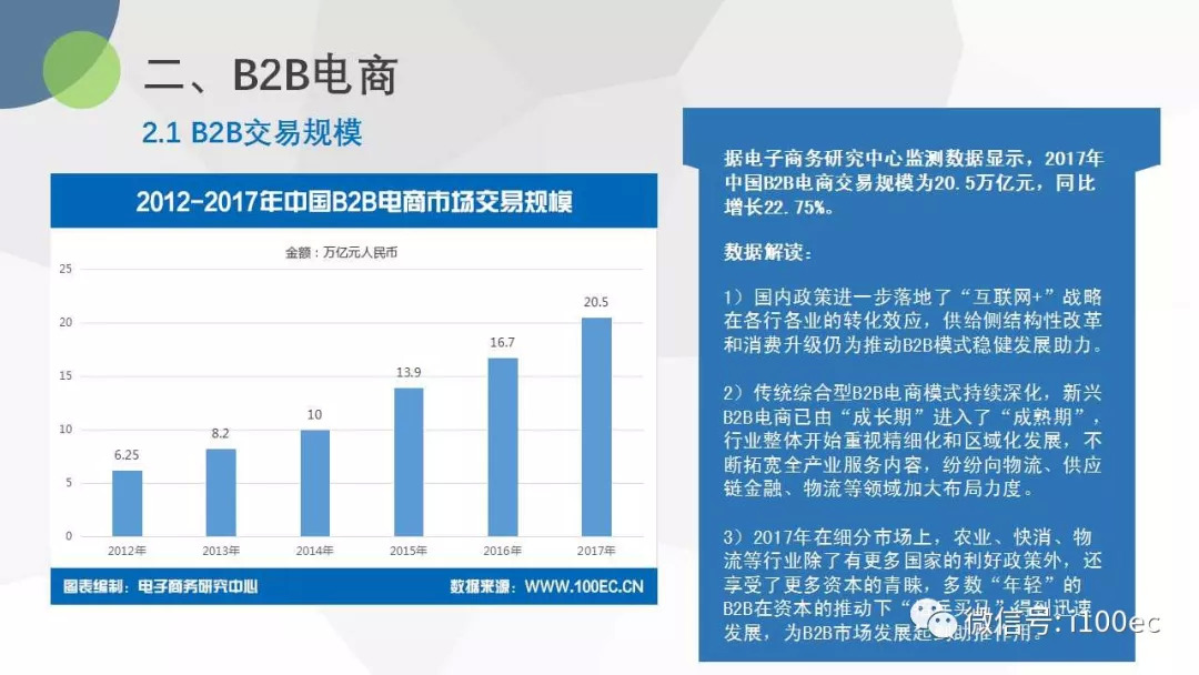 B2B交易规模:2017年中国B2B电商交易规模为20.5万亿元,同比增长22.75%。