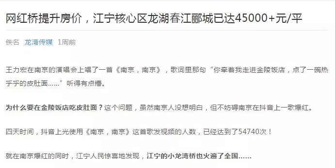 此前,龙湖春江郦城的业主在微信公众号龙湾传媒上发布了一篇《网红桥提升房价,江宁核心区龙湖春江郦城已达45000+元/平》,以下为稿件部分内容: