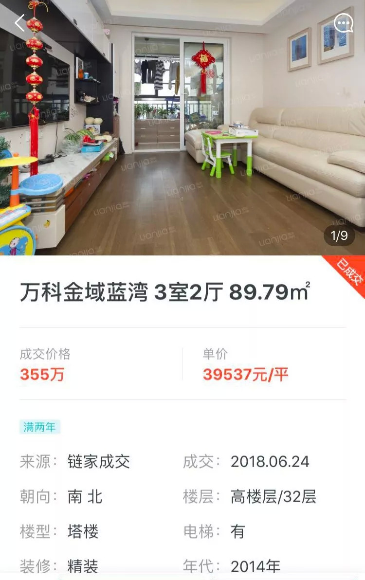 其中,万科金域蓝湾一套89.79㎡的高楼层房源以355万成交,单价39537元/㎡,一套129.87㎡的房源490万成交,单价37731元/㎡;该小区在365二手房网站上的本月挂牌均价是36783元/平;