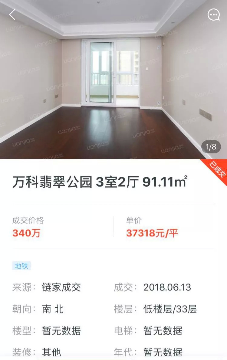 万科翡翠公园一套91.11平的低楼层房源以340万成交,单价37318元/平,该小区在365二手房网站上的本月挂牌均价是37483元/平。