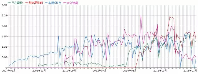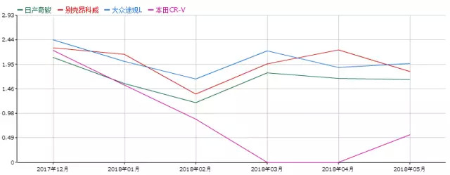 ▲合资SUV近年四强车型销量对比,单位:万辆,时段:2017年12月-2018年5月