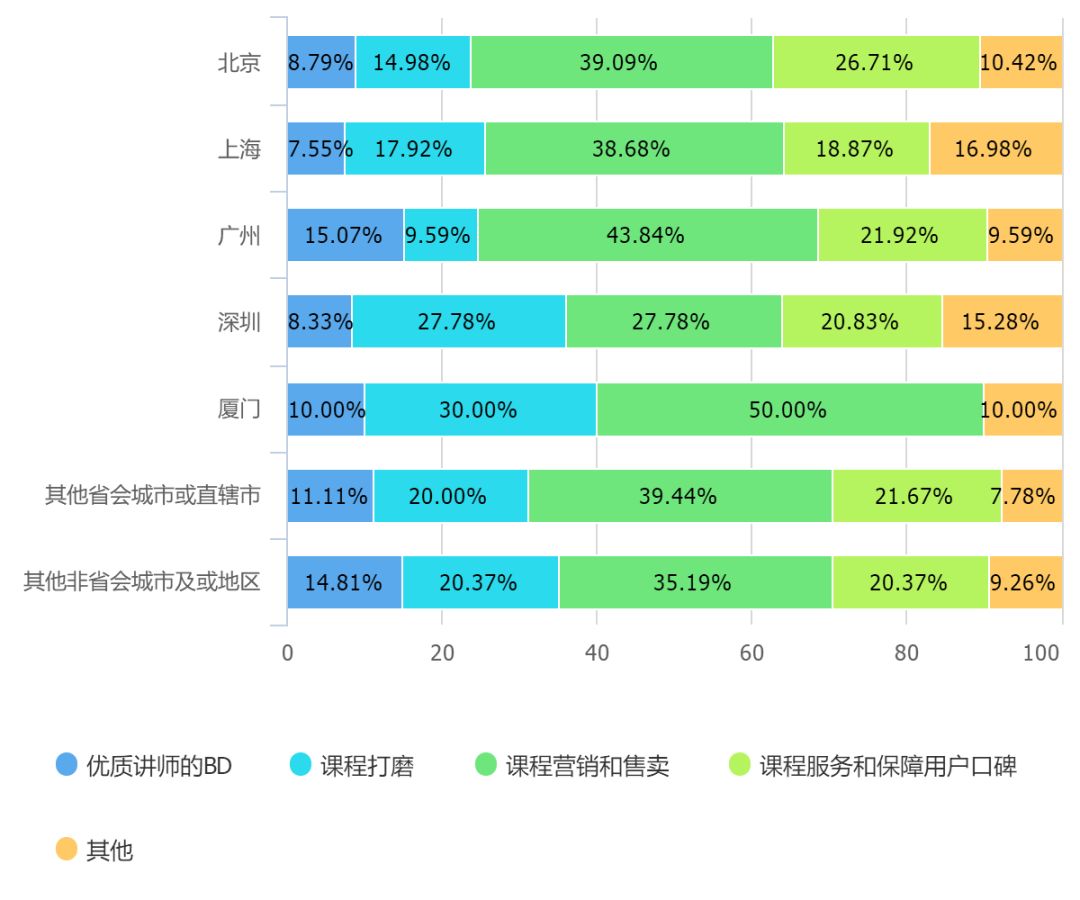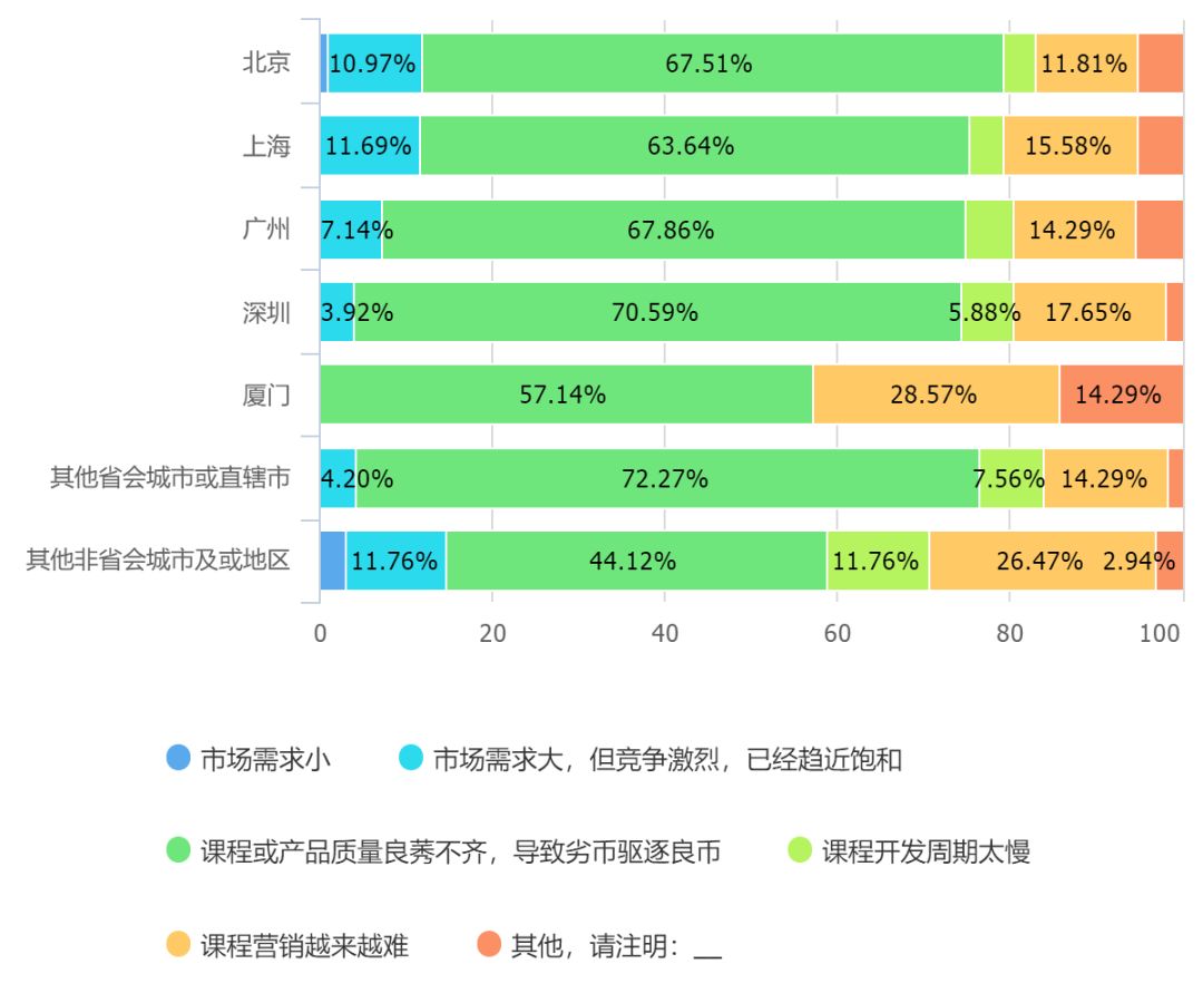 我们再来看行业从业者的感知。北京地区产业集聚的趋势虽然明显,但是认为课程营销是目前行业最大问题的比重却最小,换句话说,课程营销的难度并不是最主要困难。而从业者最少的非省会城市或地区,认为课程营销是主要问题的比重最大。