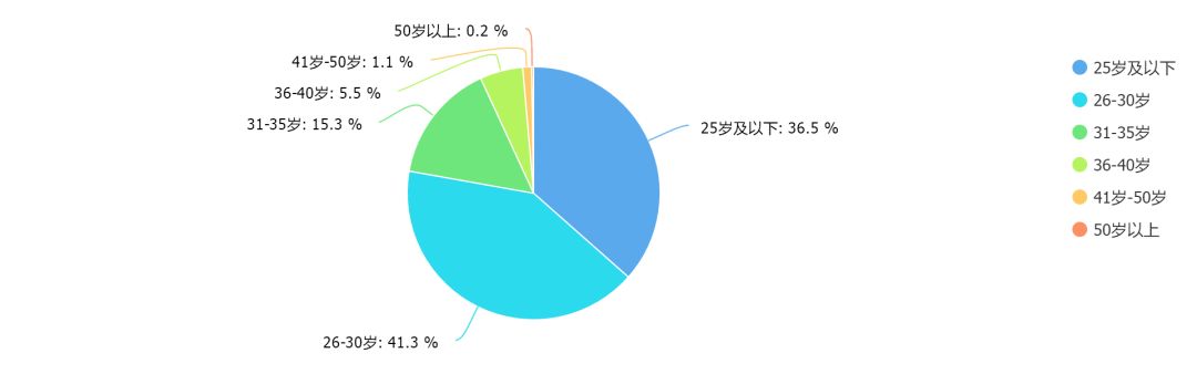 知识付费和在线教育行业是年轻职场人的战场。30岁以下的从业者占比80%以上,25岁以下也有36.6%。当然存在这样一种可能性,职位更高、年龄更大、时间更贵的从业者填问卷的可能性低,造成统计偏差。但仍然可以看出,行业的一线从业者年轻化特征明显。