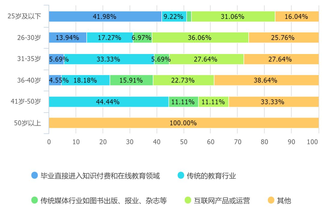 我们发现一个有意思的数据:在25岁以下的从业者中,有41.98%的人是毕业后直接进入知识付费和在线教育行业,31.06%是从互联网产品和运营岗位转入。在25-30岁这个年龄段中,占比36.6%的人是从互联网产品或运营转入,是所有路径中占比最大的一个。