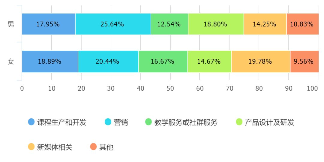 另外,统计数据中,56.2%的从业者是女性,略多于男性占比。其中,男性最主要从事的两个岗位是营销、产品设计和研发,而女性最主要从事的岗位是营销、新媒体相关类,但差异不明显。