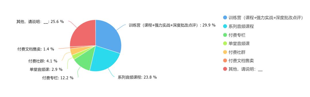 统计了选择“其他”这部分受访者的数据,我们发现训练营之外,最主要的产品形式是系列音频课程、系列视频课程和直播课程。