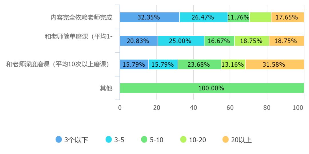 尽管自有团队研发课程速度较慢,但另外一个有趣的数据是,内容完全依赖老师完成的课程生产速度远低于和老师深度磨课的速度,一个符合逻辑的解释是,当企业找外部的老师合作,越是投入到更多精力磨课,双方越是会寻求效率的提升,降低时间成本。
